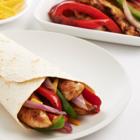 SEASON chicken with chili powder, cumin, garlic powder, pepper and half the oil. HEAT remaining oil in skillet over medium-high heat. Cook chicken until golden and cooked through, about 3-4 minutes per side. Add onions and peppers. Continue cooking until onions are tender crisp, about 5 minutes. DIVIDE chicken mixture between warmed tortillas. Fold in both edges and roll up to serve.
