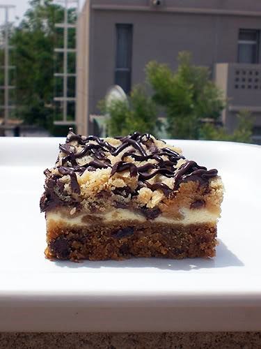Pour batter into baked crust. Drop cookie dough by teaspoonfuls over the top of the filling. Bake about 30 minutes, or until set. Transfer to wire rack.