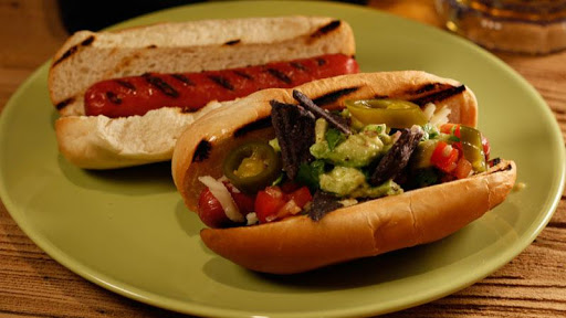 Cook the hot dogs: Grill the hot dogs until golden brown on all sides, about 7 minutes. Remove to a plate. Grill the buns, cut side down, until lightly golden brown, about 20 seconds.