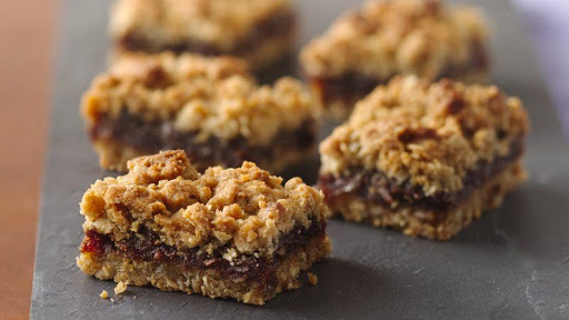 3. In large bowl, stir brown sugar and butter until well mixed. Stir in flour, oats, baking soda and salt until crumbly. Press half of the crumb mixture evenly in bottom of pan. Spread with filling. Top with remaining crumb mixture; press lightly.