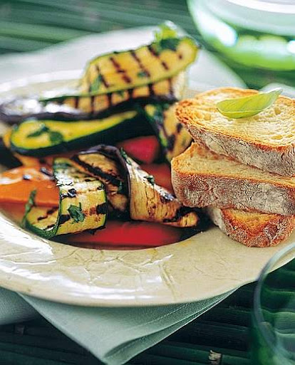 Slice the loaf of bread and grill until slightly charred. Serve the vegetables with the bruschetta.