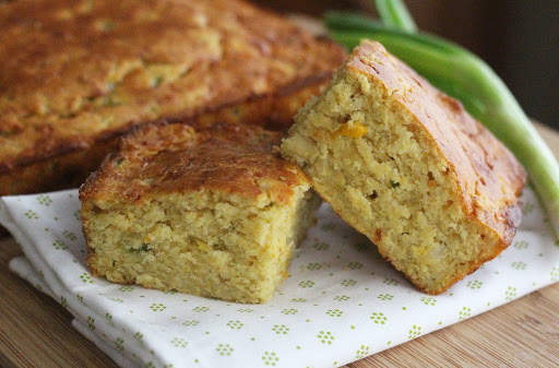 Preheat the oven to 425° and butter the sides and bottom of a 9 x 9 inch non-stick baking pan. Set aside. In a large mixing bowl, sift together the yellow cornmeal, all-purpose flour, baking powder, granulated sugar, garlic salt and ground cumin.