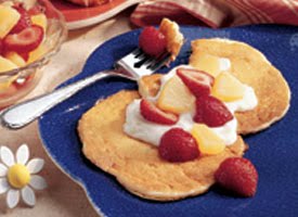 Cook until edges are dry. Turn; cook until golden brown. Serve topped with fruit and additional yogurt.