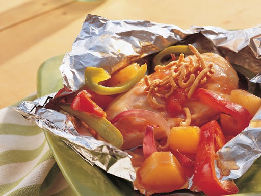 2. On one side of each foil piece, place 1 chicken breast. Top each with 1 tablespoon sweet-and-sour sauce and one-fourth of the pineapple, bell pepper and onion. Top with remaining sauce.