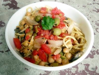 Lastly, begin caramelizing the remaining onion. When it's just starting to caramelize, add the tomato and a handful of chopped green olives. Wipe off any excess oil. Cover the top of the noodles with the onions/olives/tomatoes and serve :).