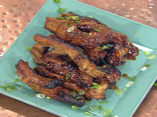 Combine the rice wine, soy sauce, hoisin, brown sugar, garlic, chile garlic sauce and five-spice powder and whisk to blend. Pour half of the marinade over the cooled ribs and toss to coat. Cover with plastic wrap and refrigerate, stirring occasionally, for 2 hours or up to overnight. Reserve the remaining half of the marinade in a non-reactive container and refrigerate.
