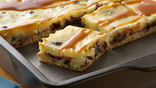 Spread filling over crust. Bake 25 to 30 minutes or until edges are set and firm to touch. Cool 1 hour on cooling rack. Refrigerate 1 to 2 hours to set. Cut into 6 rows by 4 rows. Serve drizzled with caramel. Store covered in refrigerator.