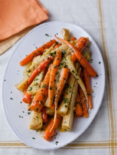 Trim and scrub or peel the carrots and parsnips. If the parsnips are thick, slice them in half or quarters lengthwise so they are about the same width as the carrots.