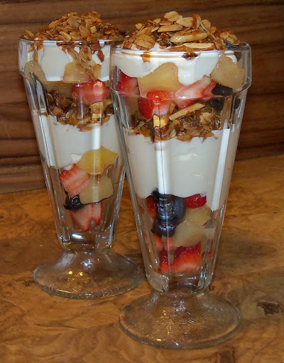 In 4 ice cream sundae glasses, layer first the fruit, then the yogurt, and the cooled granola alternately until you fill the glasses.