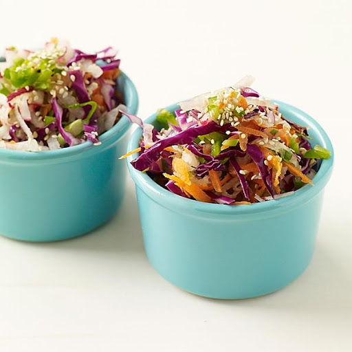 In a large bowl, combine carrots, cabbage, radishes, jicama, scallions, mint and jalapenos.