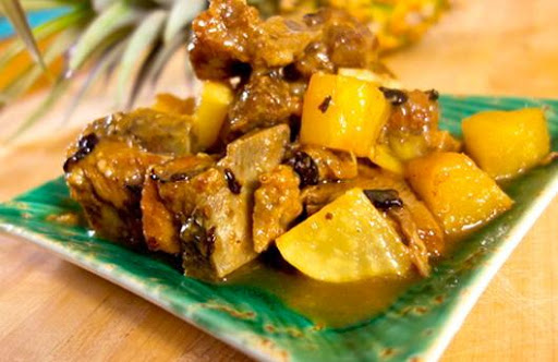 When all ribs are browned, place spareribs back into pan and add in the cider vinegar, water, salt, sugar, shoyu, garlic, ginger and Chinese black beans. Bring to a boil then simmer gently until the ribs are tender, approximately 1- 1 ½ hours.