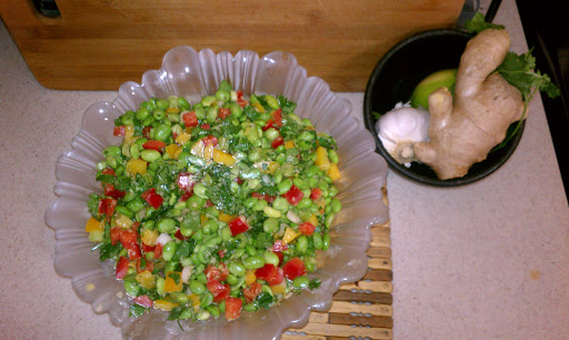 Cook edamame according to package directions. Cool. Combine beans, diced peppers, sliced green onions and chopped cilantro.