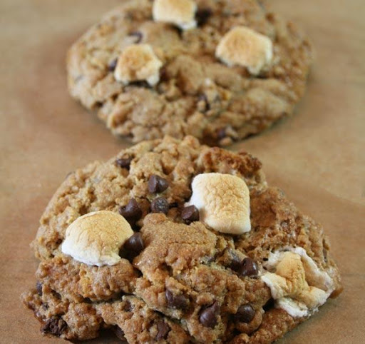 Combine butter and sugars in a large bowl. With an electric mixer on low speed, beat until light and fluffy. Add eggs and vanilla; beat until smooth. In a separate bowl, mix flours, baking soda and salt; add to butter mixture. Beat with mixer on low; gradually increase to medium and beat well. Add chocolate chips, cracker crumbs and marshmallows; mix well with your hands. form into large palm-size balls. Place balls on parchment paper-lined baking sheets, 2 to 3 inches apart. Bake at 375 degrees for 15 minutes, or until just turning golden. Cool slightly; remove to wire racks and cool completely. If desired, swirl melted chocolate over cooled cookies.