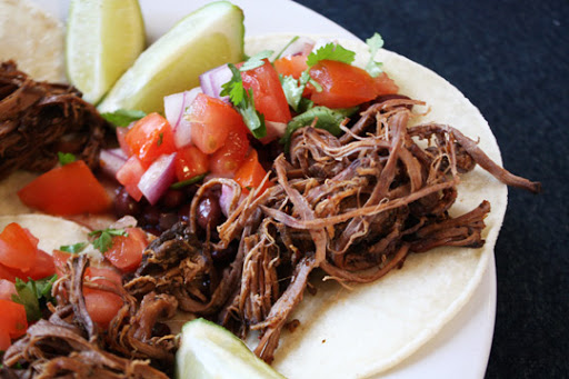 Remove meat from slow cooker and place on rimmed baking sheet. Use two forks to pull the meat apart. Discard the fat, if desired. Place shredded beef in large bowl and ladle cooking liquid over the top a few scoops at a time. You want the meat to hold the liquid but not swim in it. Return it to your slow cooker after you have removed the remaining liquid. Serve with fresh tortillas, onion, cilantro, and salsa.