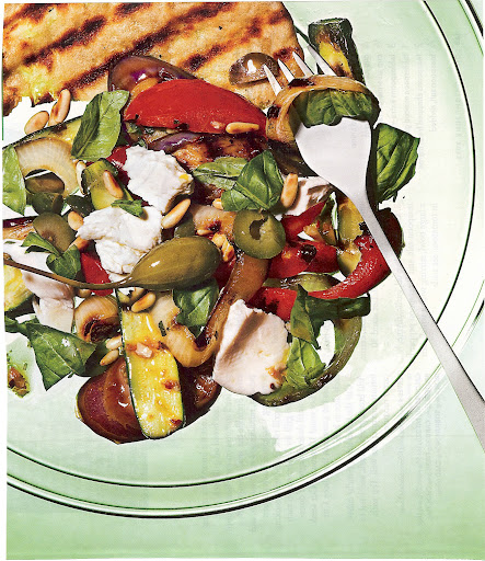 4. To prepare salad, lightly coat eggplant and the next 3 ingredients (through onion) with cooking spray. Arrange eggplant and zucchini on grill rack coated with cooking spray; grill 1 1/2 minutes on each side or until tender and well marked. Arrange bell pepper and onion on grill rack; grill 3 minutes on each side or until well marked.