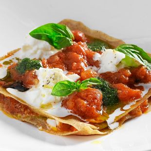lasagnette di farina di farro con pomodori, burrata e pesto