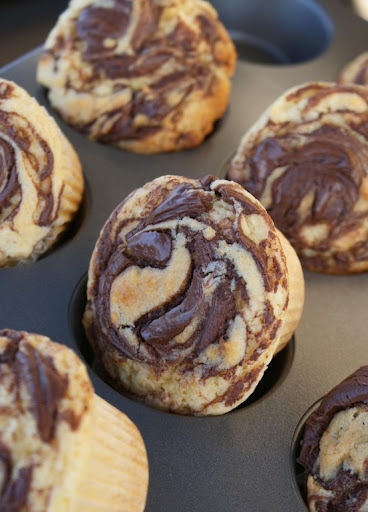 Divide the batter between 12 paper-lined muffin cups. Drop a spoonful of Nutella on top of each, and swirl through the batter with the tip of a bamboo skewer, knife or other pointy object. Bake for 25-30 minutes, or until springy to the touch. Tilt them in the pan to help them cool. Makes a dozen cupcakes.