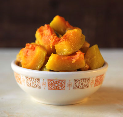 In a large heavy saucepan, begin bringing the water to a boil. As the water heats, layer the squash in the pan skin side down, sprinkling with ginger as you go. Once the water has come to a boil, cover and cook over medium-high heat until squash can easily be pierced with a fork, 10-15 mins.