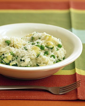 3. When almost finished, stir in the zucchini, sun-dried tomatoes, and thyme, adding stock as needed and stirring continuously. Stir in basil and 3 tablespoons cheese just before serving. Divide risotto among 6 bowls, sprinkle with remaining cheese, and season with pepper to taste.