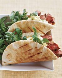 Meanwhile, light a grill. Brush the steaks and pita bread with oil. Grill the pita for 30 seconds per side, just until heated and lightly toasted. Immediately wrap in foil to keep soft. Season the steaks with salt and pepper and grill over moderately high heat for about 10 minutes, turning once, for medium-rare meat. Transfer the steaks to a board and let rest for 10 minutes. Thinly slice the steaks across the grain.