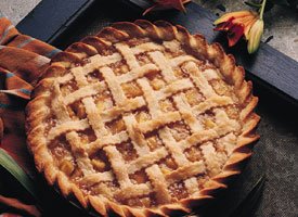 Roll other round of pastry into 10-inch round. Cut round into 1/2-inch strips. Place 6 strips across filling. To make lattice top, weave a cross-strip through center by first folding back every other strip going the other way. Continue weaving lattice, folding back alternate strips before adding each cross-strip, until lattice is complete. Trim ends of strips. Fold trimmed edge of bottom crust over ends of strips, building up a high edge; seal and flute. Cover edge with 3-inch strip of foil to prevent excessive browning during baking.