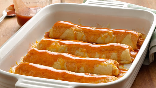 1 Heat oven to 375°F. Grease 13x9-inch (3-quart) glass baking dish with shortening or cooking spray. In medium bowl, mix chicken and 1/2 cup of the enchilada sauce.