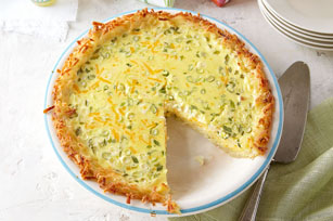 BAKE 20 min. or until golden brown. Meanwhile, whisk eggs and milk in medium bowl until blended. Stir in sour cream, then cheese and onions.
