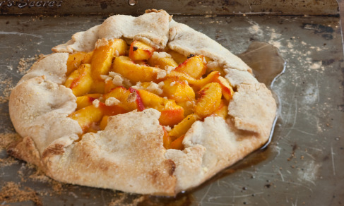 To prepare filling, toss peaches with 2 tablespoons flour and 1/4 cup granulated sugar. Pile onto center of dough. Fold up edges of dough to cover peaches partially. Sprinkle with turbinado sugar. Bake 25 minutes or until browned.