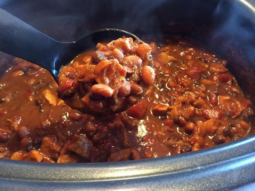 The chili is done after 10 minutes of simmering, but I like to let it go for a couple of hours for a deeper flavor.