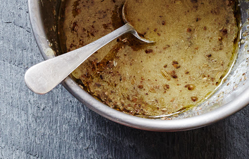 Toast coriander, cumin, and fennel seeds in a dry small skillet over medium heat, tossing, until fragrant, about 3 minutes. Let cool, then chop. Whisk with oil, vinegar, and mustard in a small bowl; season with salt and pepper.