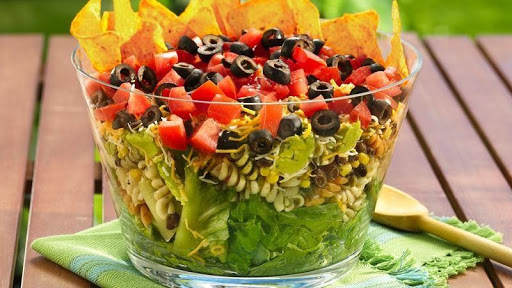 3 In 4-quart glass salad bowl or 13x9-inch glass baking dish, layer lettuce and pasta mixture. Spread guacamole evenly over top. Sprinkle with cheese and tomatoes; top with olives.