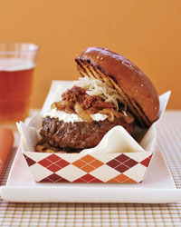 Spread the cut sides of the buns with the melted butter and toast on the grill. Transfer the burgers to the buns. Top with the Griddled Onions, sauerkraut and Red Chili and serve.