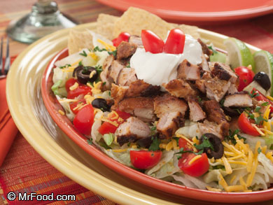 Meanwhile, arrange lettuce, tomatoes, and olives on a serving platter. Slice chicken thighs and place over salad, sprinkle with cheese, and serve with your favorite dressing.