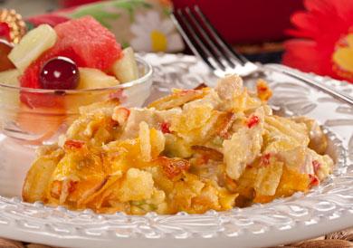 In a large bowl, combine chicken, celery, onion, pimientos, soup, and mayonnaise; mix well and pour into an 8-inch square baking dish. Sprinkle with cheese and potato chips.