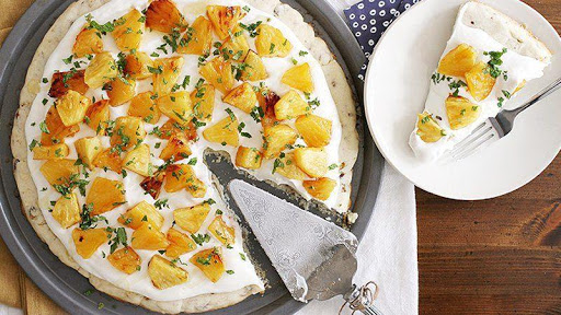 This dessert pizza is best served immediately. If you want to make it ahead of time, leave the crust on the pizza pan; cover and refrigerate. Top with cream topping, pineapple, mint and honey just before serving.