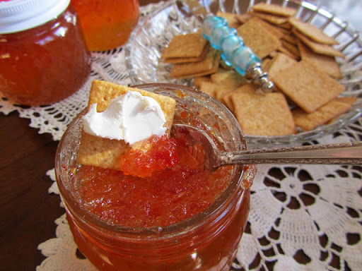 Pour hot jelly into hot sterilized jars, leaving ¼ inch head space. Wipe jar rims with clean damp cloth. Cover with metal lids and screw on bands; Process in hot water bath for 15 minutes. Makes 12 half pints.