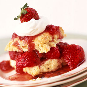 One large shortcake can also be made: Spread dough in 9"-round or 8"-square greased cake pan. Bake at 425°F for 20-25 minutes. Cool 5 minutes; remove from pan. Can be cut into wedges or squares before splitting and prepared as for individual shortcakes, or split, filled, and garnished to make one large shortcake.