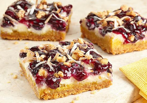 Beat cream cheese until fluffy in a large mixing bowl. Add the remaining 2 eggs and confectioners’ sugar. Pour over cake mixture in pan and spread blueberry fruit filling on top and sprinkle with coconut and nuts.