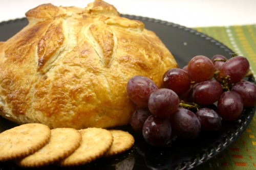Heat the oven to 400°F. Unfold the pastry sheet on a lightly floured surface. Place the cheese in the center. Fold the pastry up over the cheese to cover. Trim the excess pastry and press to seal. Reserve the pastry scraps for decoration.