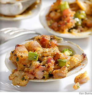 4.Remove clam meat from shells (reserving the shells), chop and stir into the breadcrumb mixture. Pull clamshells apart and spoon the breadcrumb mixture into the half shells, packing lightly and mounding slightly (you may have a few shells left over).