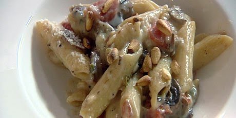 2. In a large skillet over high heat, sauté the mushrooms in the butter until they release their liquid and turn golden. Season with salt and pepper. Add the scallions and garlic. Continue cooking about 2 minutes. Add the pasta and heat through. Deglaze with the vodka. Flambé. Add the béchamel and tomatoes and stir to combine. Adjust the seasoning.