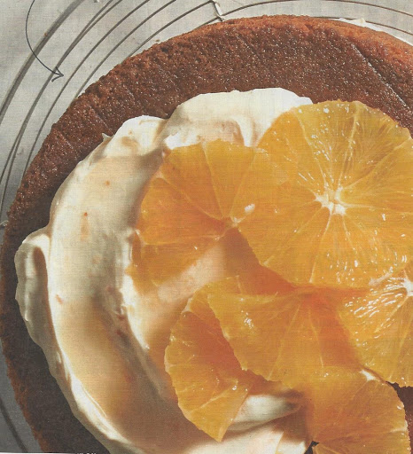 4. To assemble, spread one cake round with half the Orange Mascarpone Cream. Top with second cake round, remaining Orange Mascarpone Cream, and orange slices.