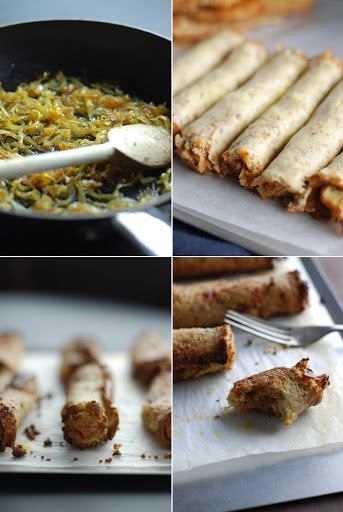 3. While the onions caramelise, roll slices of bread flat with a rolling pin (the flatter you can get it the easier it will be to roll up later). Brush both sides with melted butter or olive oil.