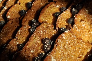 In a separate bowl, whisk together eggs/egg substitute, nog, vanilla and spices. Pour over top of the bread-lined pan, evenly coating each slice. Sprinkle remaining sugar, nuts and/or blueberries on top and cover the pan tightly with plastic wrap. Refrigerate overnight or for at least 2 hours.