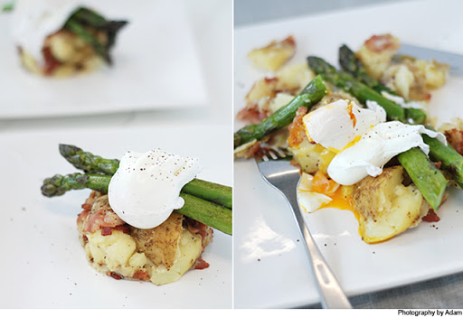 7. To serve place half the potato and bacon mixture on each plate, top with three asparagus spears, and finish with a poached egg. Season well with freshly ground salt and pepper.