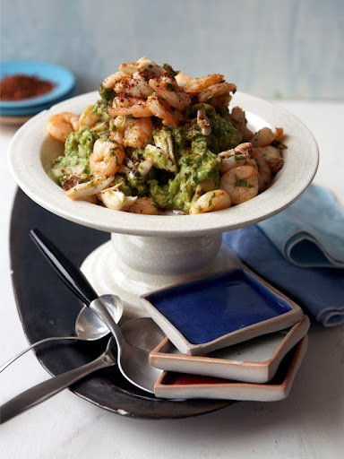 With a slotted spoon, transfer about half of the seafood mixture into the guacamole, and stir.