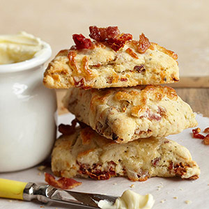 Place wedges 2 inches apart on a very large ungreased baking sheet. Bake for 5 minutes. Sprinkle tops of scones with cheese. Bake 7 to 8 minutes more or until tops are lightly browned. Serve warm. Top with additional crumbled bacon. Makes 16 scones.