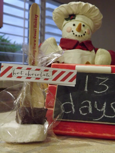 A very good recipe for yummy hot chocolate and then presented so cutely on a wooden spoon! You can make a "printable" with "hot chocolate" printed on it to wrap around the handle of the spoon.