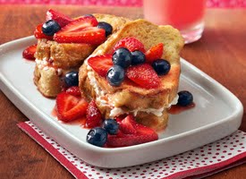 Meanwhile, slice remaining strawberries and add with blueberries to chilled strawberry mixture; mix lightly. Serve French toast with berry topping.