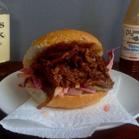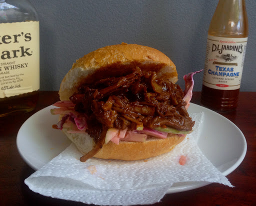 The ultimate Pulled Pork, made in 3 hours, no less! Stuff into soft white rolls with coleslaw, and apply liberal amounts of hot sauce!